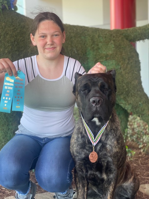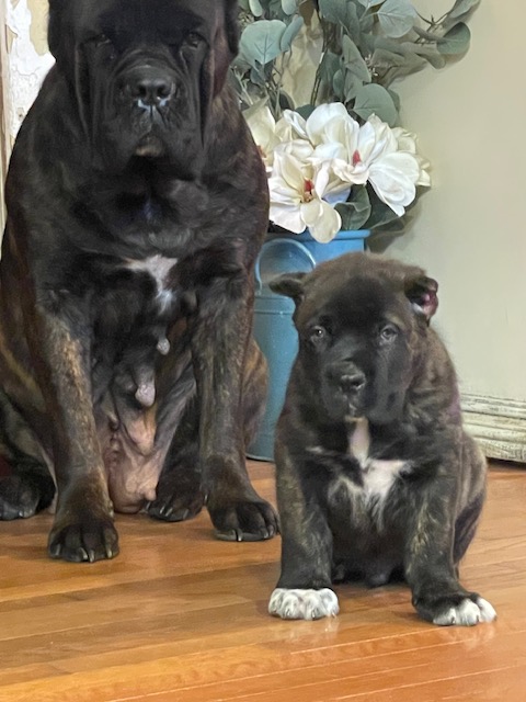 Cricket is bred and Co-Owned with Excellence Cane Corso. Cricket is happy, confident and outgoing and a total jokester. She has incredible structure, moves with complete grace and power, a correct coat and a